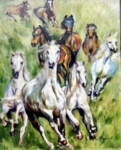 草原を疾走する9頭の野生馬。