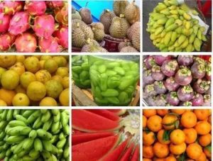 海南産のマンゴー、ライチ(特に「妃子笑」)、パラミツ(ボロミ)、レンブ、ドリアン、パイナップル、ココナッツ、ハネデューメロンが有名です。甘みが強い品種が多く、特産の辛い塩をつけて食べるスタイルが人気です。