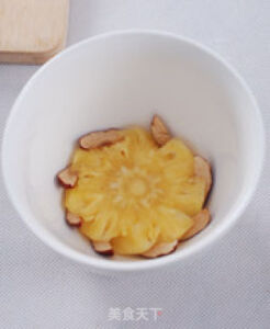 ③碗里刷一层油,铺入一片和碗底差不多大小的菠萝,然后把红枣丝嵌入菠萝的凹处。