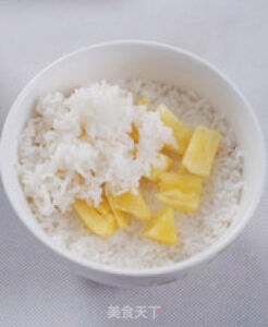 ①米饭加适量糖拌匀。菠萝留一片打底,其余切碎。葡萄干提前浸泡2小时至软,洗净备用。